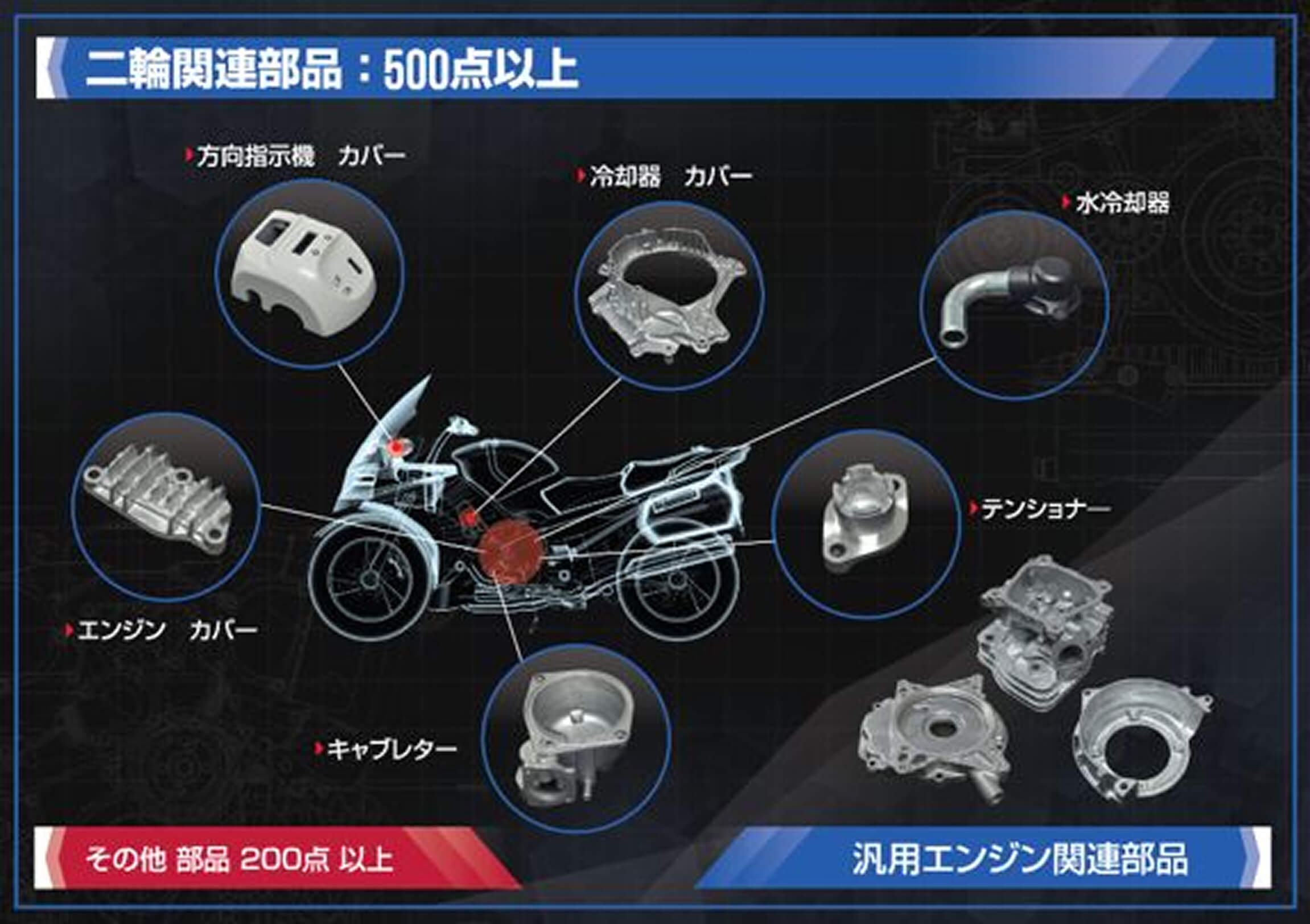 KIKUWAでは、自動車部品、二輪関連部品他、様々なジャンルの業界のダイカスト製品を取り扱っております。